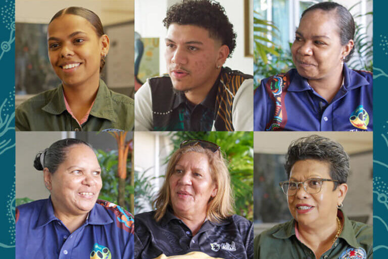 Community-based researchers from the pilot communities. Top left, Kathy Wymarra (Wuthathi), Ki-Shaun Fejo (Goondoi), Trudie Salt and Pamela Salt (Jabalbina), Bronwyn Tonga (Yuwi), and Yodie Batzke (Wuthathi). Not pictured is Josh Gibson (Yuwi).