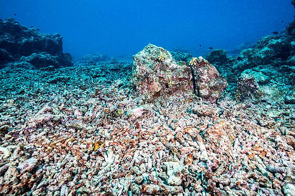 These disturbances can break large areas of coral down into rubble beds, which are made up of pieces of dead coral skeletons and rock fragments that can constantly move with the tides and waves.